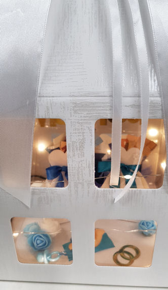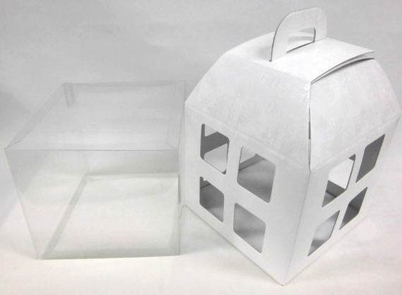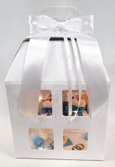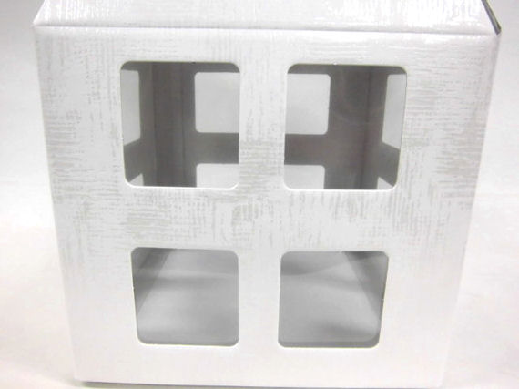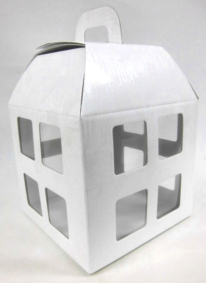 Tragekarton / Laterne, Papierartikel in Perlmuttschimmer-Optik mit Fensterbox aus Kunststoff